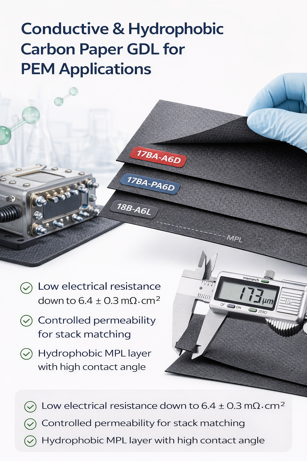 17BA-A6D、17BA-PA6D 和 18B-A6L 是初始化 PEM 燃料电池、水持续槽及氢相关能系统气体扩散层 (GDL) 基材的薄碳纸。这些碳纸属于同一系列,通常厚度为 168 µm 至 185 µm,专为稳定导电性、可控导电性和可靠结构性能的应用而设计。其中,17BA-A6D 和 17BA-PA6D 具有低电阻和均衡的导电性,而 18B-A6L 则具有稍厚的结构和相邻的微孔层(MPL)接触角,适用于需要增强表面导电性的应用。